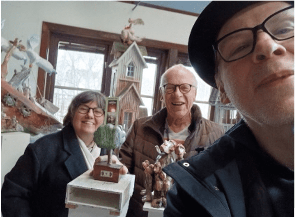 -Det konkreta priset specialbeställde vi hos den fantastiska konstnären Kjell Sundberg i Angelstad: två träskulpturer som föreställer Anotekets logga och Möllebergsstrollet med familj. På bilden ser vi från vänster Eva Fodor Velander, Kjell Sundberg och Sven Velander (som även tagit bilden).
